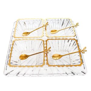 סט 4 קעריות זכוכית מרובעות – על מגש זכוכית שקופה + כפיות נירוסטה זהב