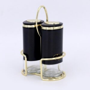 סט מלחיות – מלח פלפל זכוכית שחור על מעמד נירוסטה זהב 115 מ”ל