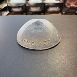 כיפה קטיפה מרוקאית 18 ס״מ – אפור מבריק ׳בבא סאלי׳ כתוביות רוז גולד