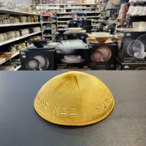 כיפה קטיפה מרוקאית 18 ס״מ – צהוב חרדל ‘רבי מאיר בעל הנס’ כתוביות זהב