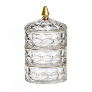 מעמד סט צנצנות – 3 קומות זכוכית זהב + מכסה 24X13 ס”מ