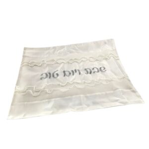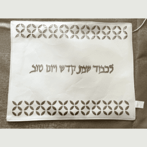מפה לכיסוי חלה – עור לבן עיגולים ‘לכבוד שבת ויום טוב’ 45X55 ס”מ