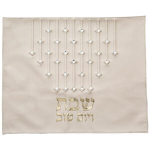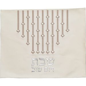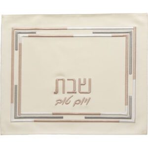 מפה לכיסוי חלה – דמוי עור שמנת וכיתוב כסף ‘שבת ויום טוב’ 42×52 ס”מ