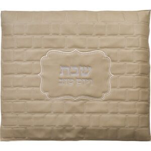 כיסוי חלה – מהודר דמוי עור קרם לבן 42×52 ס”מ ‘שבת ויום טוב’ כיתוב כסף