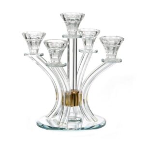 פמוט 5 קנים – קריסטל שקוף עיגול זהב 27X24 ס”מ