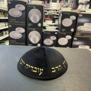 כיפה קטיפה מרוקאית 18 ס״מ – שחור ‘רבי יצחק אביחצירא׳ כתוביות זהב