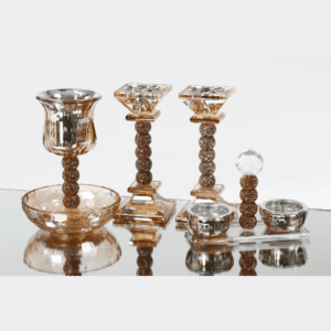 סט שבת זהב אמבר מעוטר יהלומים – זוג פמוט + גביע קידוש + מלחיה פתוחה
