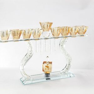 חנוכיה קריסטל – 2 עמודים קנים זהב + סביבון זהב 23X36 ס”מ