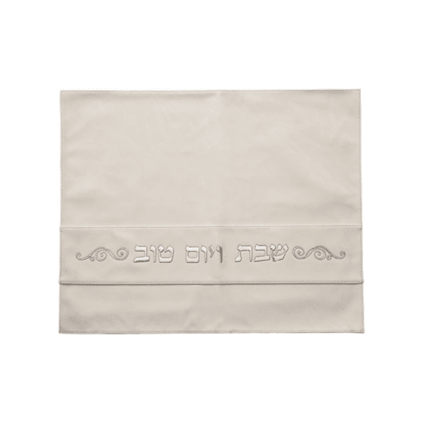 מפה לכיסוי חלה – דמוי עור שמנת וכיתוב כסף ‘שבת ויום טוב’ 42×52 ס”מ