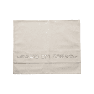 מפה לכיסוי חלה – דמוי עור שמנת וכיתוב כסף ‘שבת ויום טוב’ 42×52 ס”מ