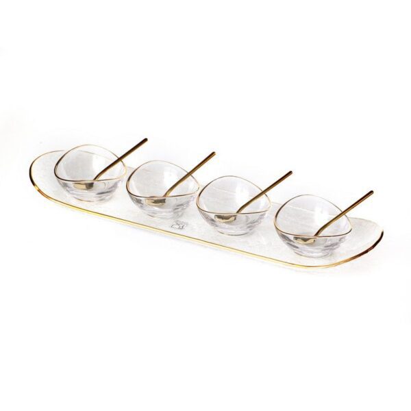 סט 4 קעריות הגשה – זכוכית שקופה על מגש עגולות פס זהב וכפיות 50/15 ס”מ עומק 4.5 ס”מ